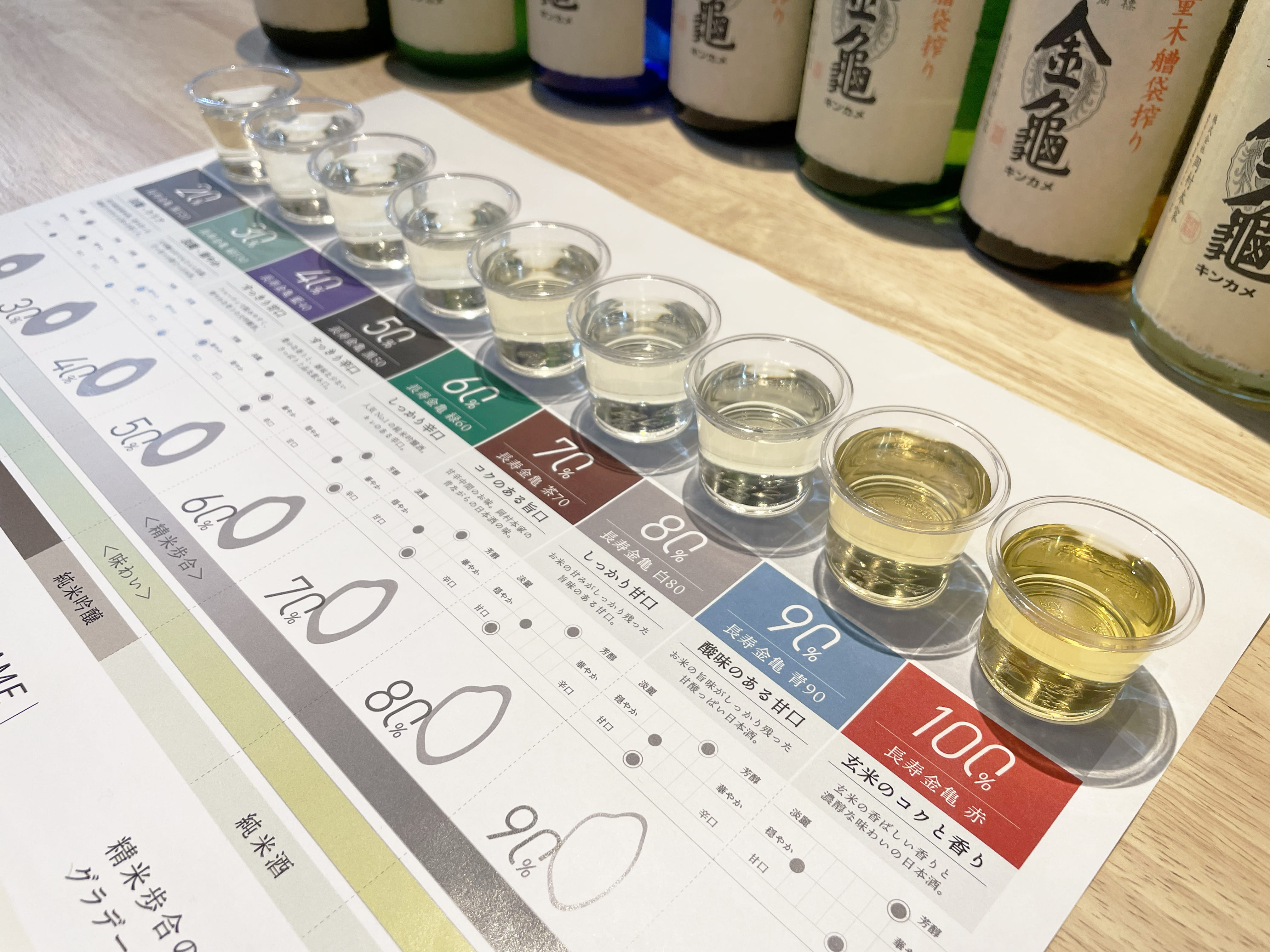 定番銘柄の純米酒「長寿金亀」は、精米歩合を細かく変えて、多くの日本酒が販売されています。