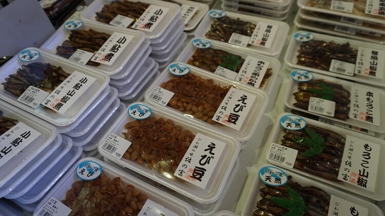 店頭には、スジエビのほかにも旬の湖魚の佃煮が並びます。