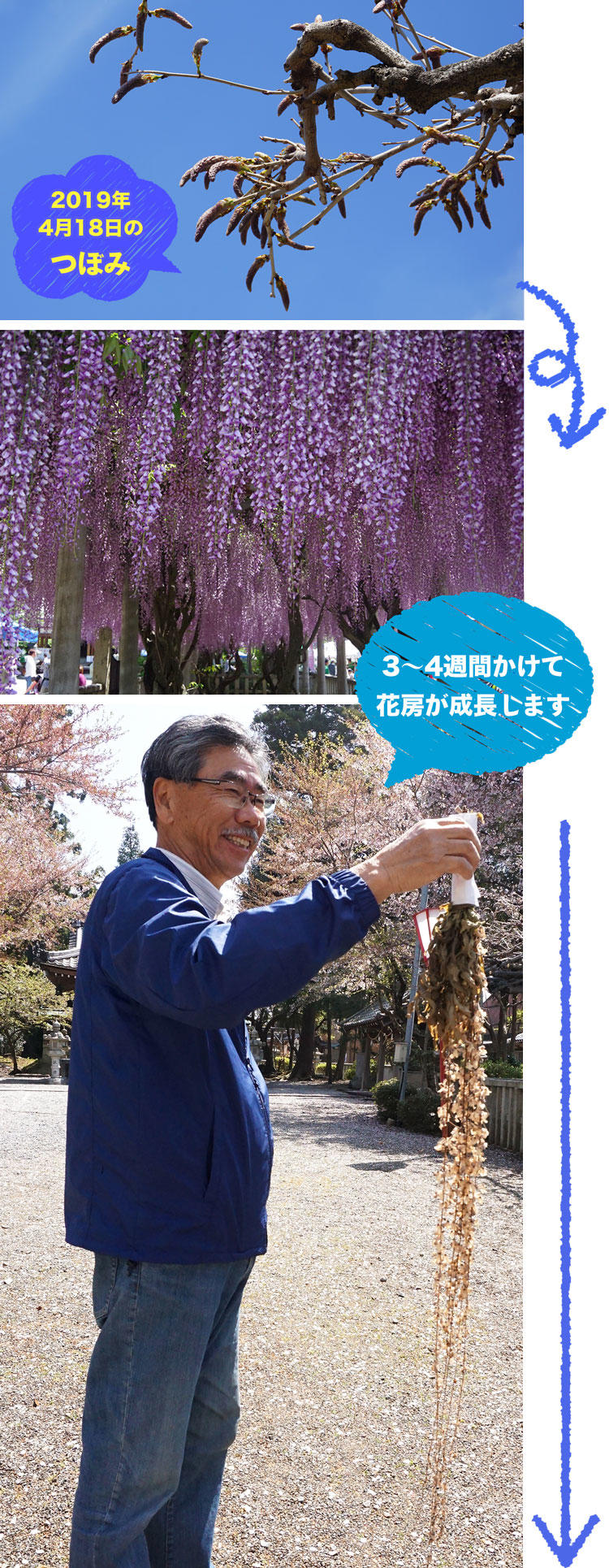 その藤が300年以上の歳月を経て見事なつるを伸ばし、毎年5月上旬から中旬にかけて、長いものでは1m以上にも達する花房が垂れさがり、開花の時期は連日多くの人でにぎわいます。