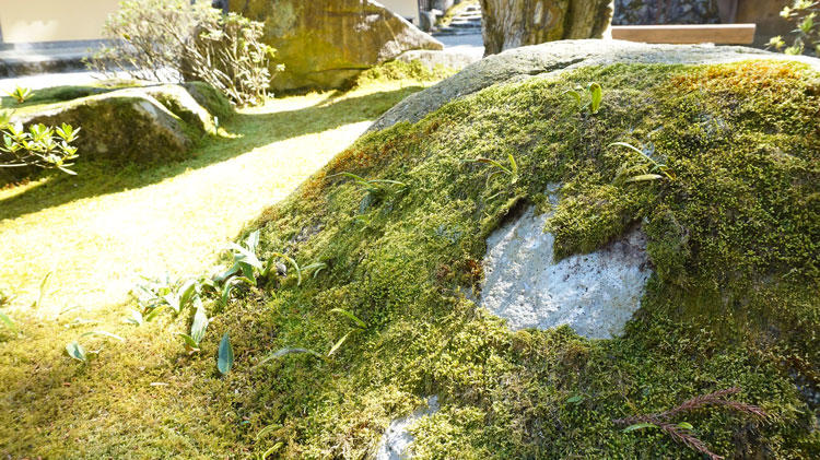 初夏には、庭園にじゅうたんのように広がったコケと鮮やかな新緑の景色が広がります。