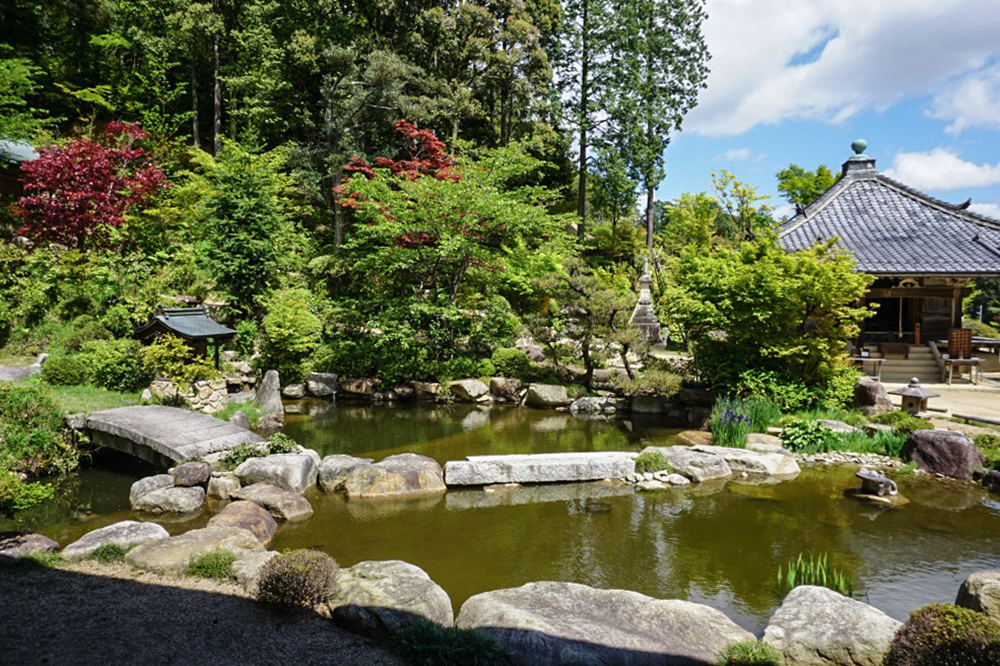 本堂横の百伝(ももつて)池です。周囲の新緑がとても鮮やかでした。