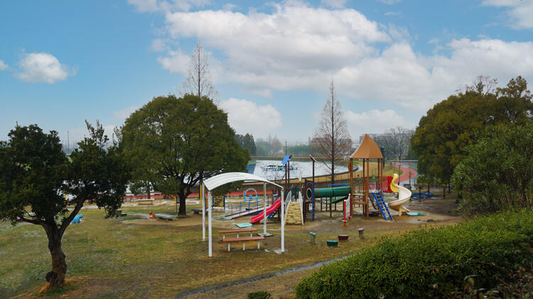 屋外イベントに利用される「夢の庭」、子どもたちが楽しめる大型遊具「忍者の砦」や丘の上には、甲賀創健館・図書館・生涯学習館がある公園です。