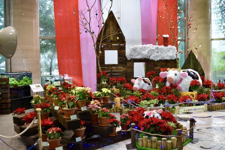 水生植物公園みずの森では、毎年この時期にポインセチアと新年の干支をコラボした作品を展示しています。(去年の様子はこちら)