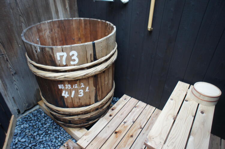 中庭に酒樽風呂を発見!入ったら気持ちよさそう。