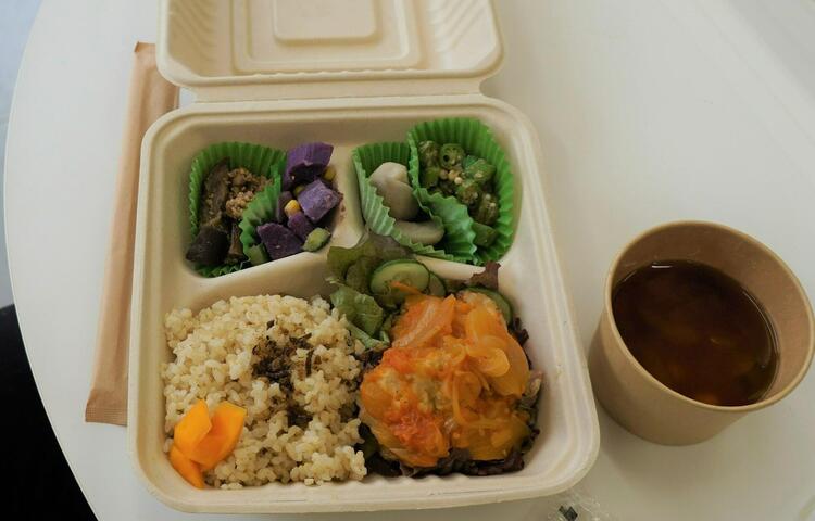 オモヤキッチンが運営している「おもや農園」で育った、安心・安全の野菜やお米を使ったお弁当をいただきました。