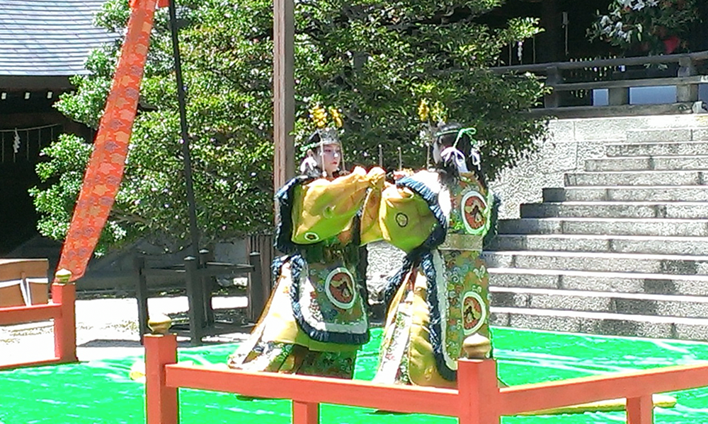 舞楽「納曽利(なそり)」の奉納。その昔、宮廷の池に雌雄の青龍が降り立ち、天皇の長寿を祝って舞い遊んだ様子を描いたものだそうです。宮内に染み渡る優雅な旋律に、しばし悠久の時に思いを馳せました。